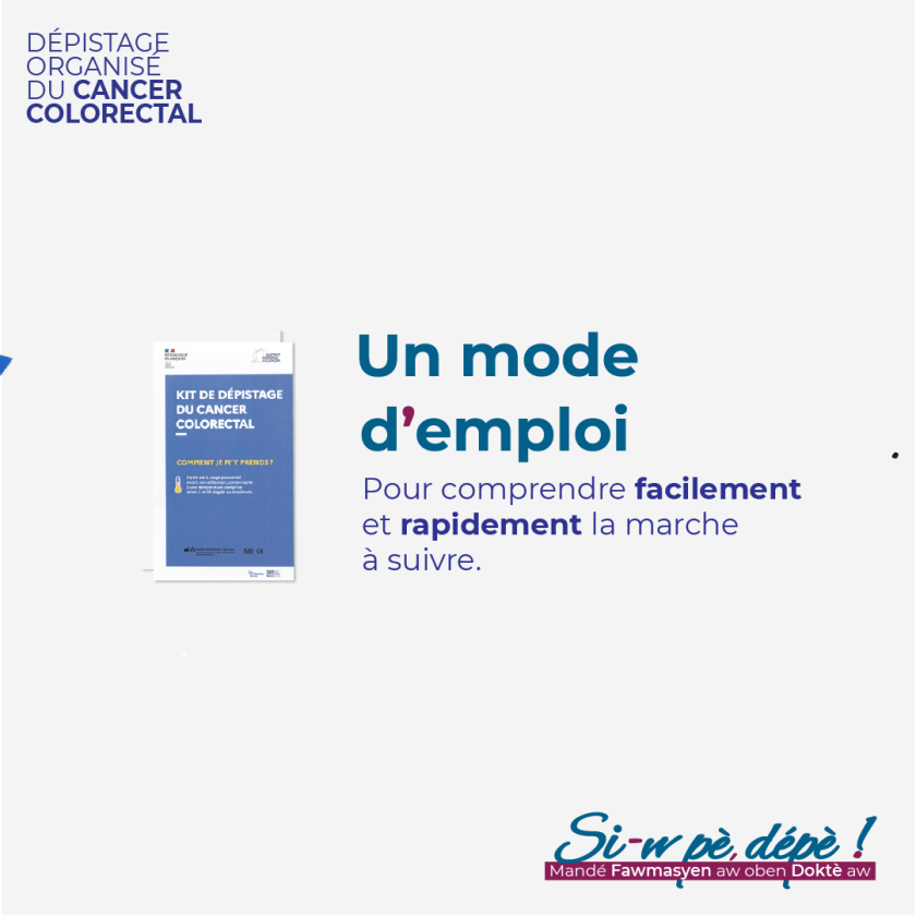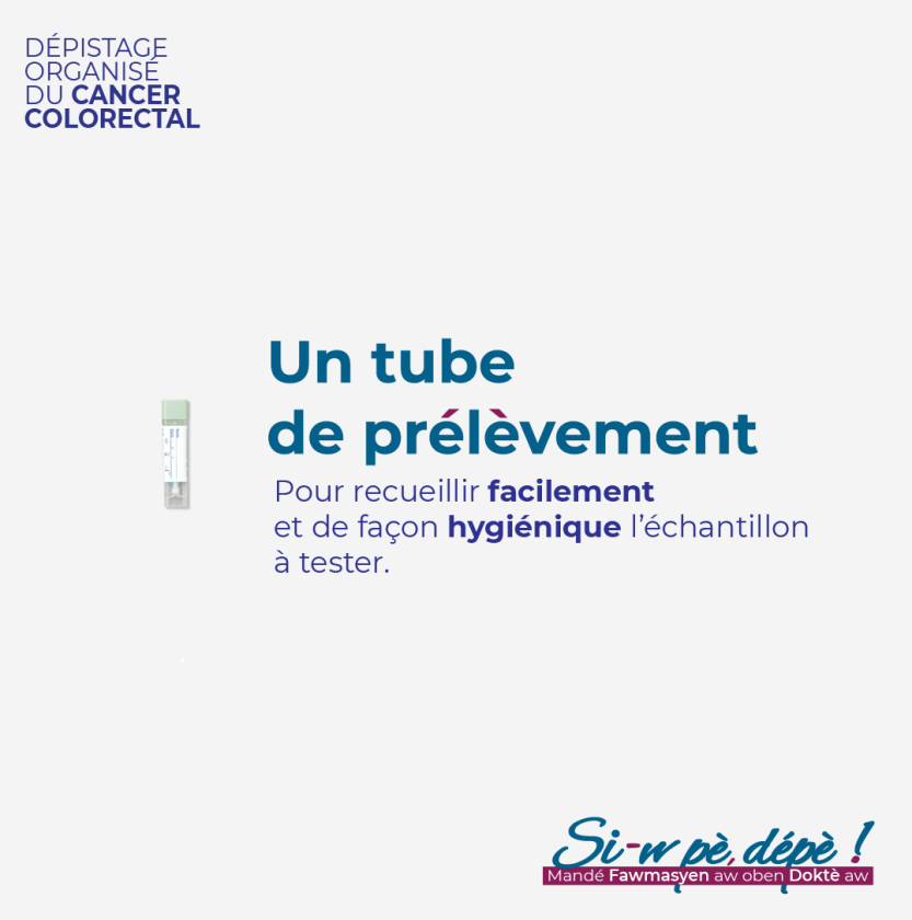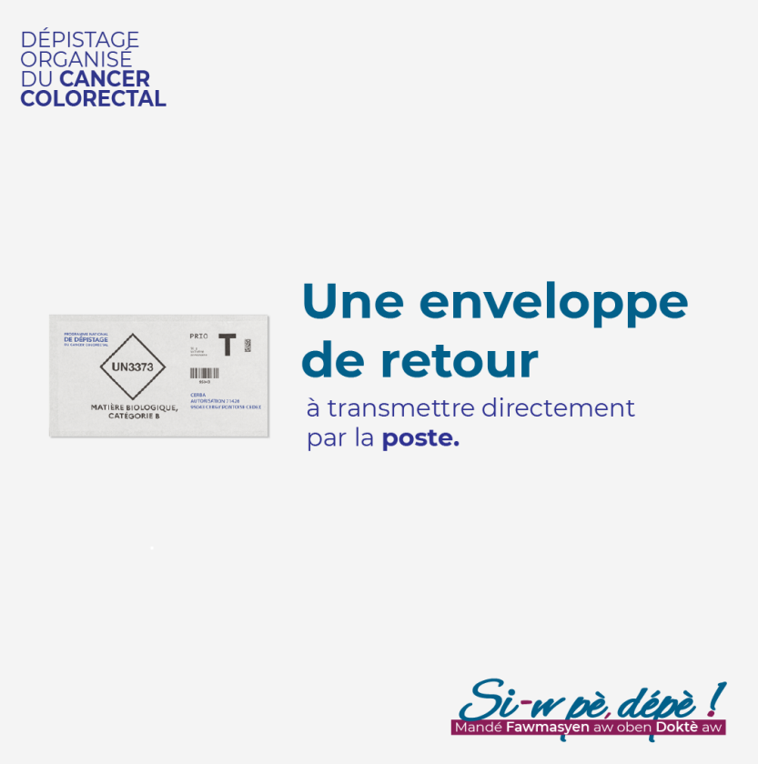Le test de dépistage du cancer colorectal est à faire chez vous : il est fiable, simple, rapide et fourni avec un mode d'emploi. Une fois le test réalisé, il suffit de l'envoyer dans l'enveloppe T fournie dans le kit par la poste sous 24h en privilégiant les débuts de semaine et à éviter les veilles de week-end ou de jour férié.